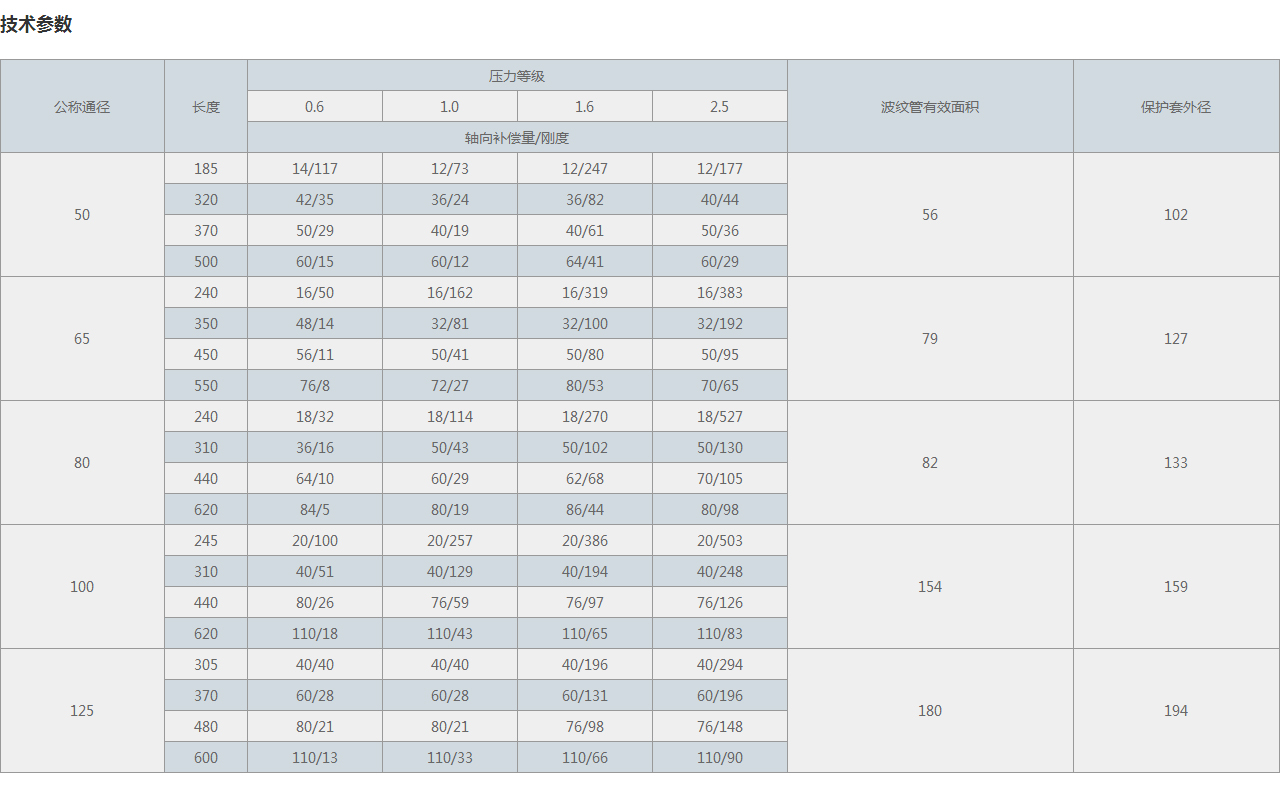 公稱通徑 長(zhǎng)度 壓力等級(jí) 波紋管有效面積 保護(hù)套外徑