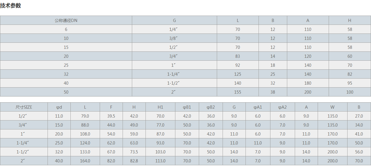 尺寸SIZE φd L F H H1 φB1 φB2 G φA1 φA2 A W B