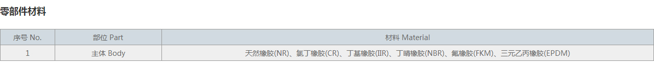 1 主體 Body 天然橡膠(NR)、氯丁橡膠(CR)、丁基橡膠(IIR)、丁晴橡膠(NBR)、氟橡膠(FKM)、三元乙丙橡膠(EPDM)