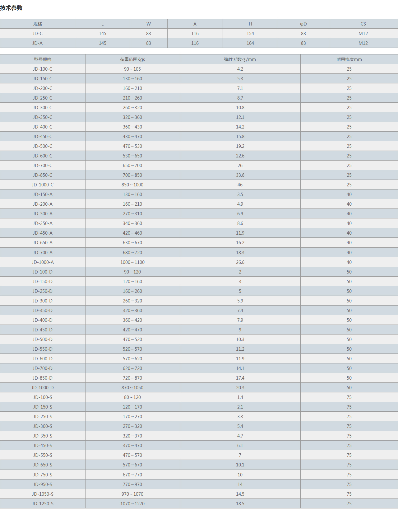 型號(hào)規(guī)格 荷重范圍Kgs 彈性系數(shù)㎏/mm 適用撓度mm