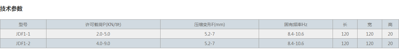 型號(hào) 許可載荷P(KN/塊) 壓縮變形F(mm) 固有頻率Hz 長(zhǎng)