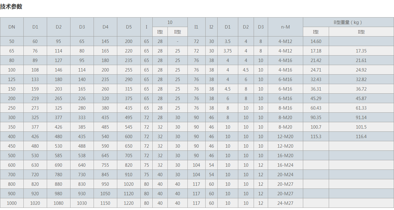 DN D1 D2 D3 D4 D5 I 10 I1 I2 D1 D2 D3 n-M B型重量(kg)