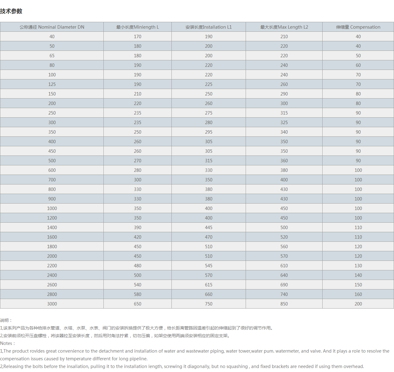 公稱通徑 Nominal Diameter DN 很小長度Minlength L 安裝長度Installation L1 很大長度Max Length L2 伸縮量 Compensation