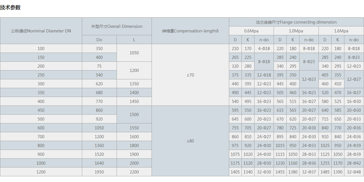公稱通徑Norminal Diameter DN 外型尺寸Overall Dimension 伸縮量Compensation-lengthδ 法蘭連接尺寸Flange connecting dimension